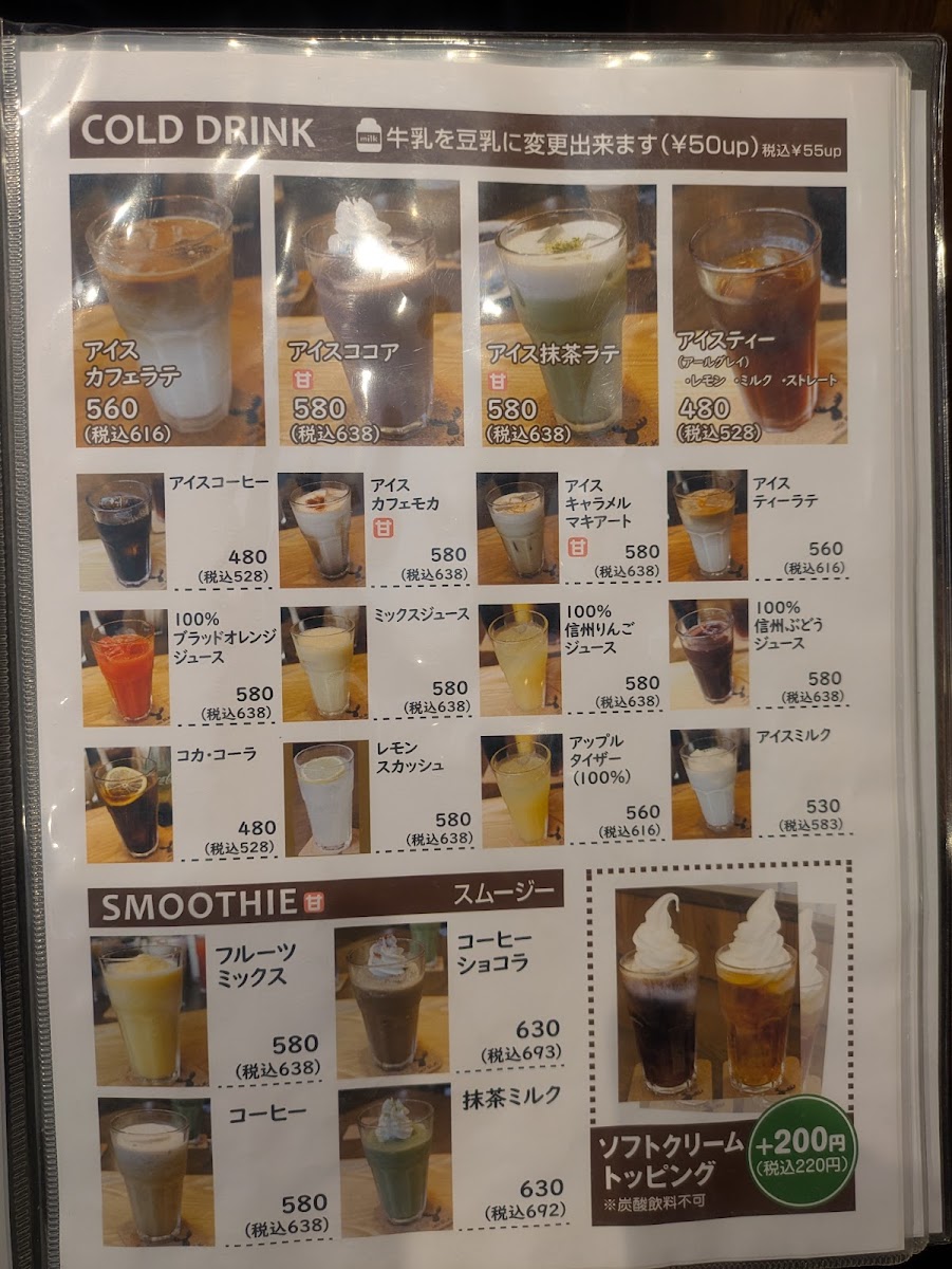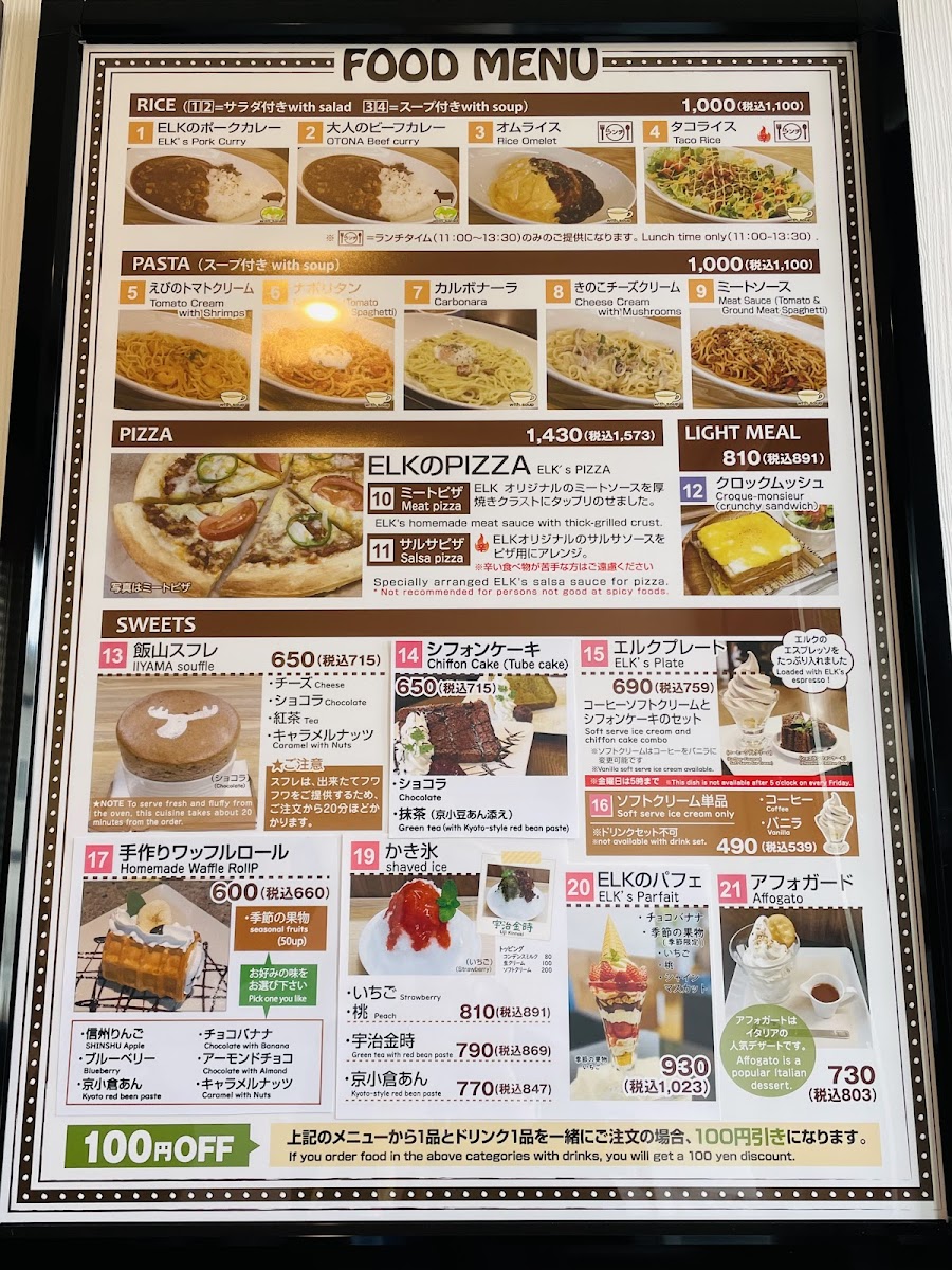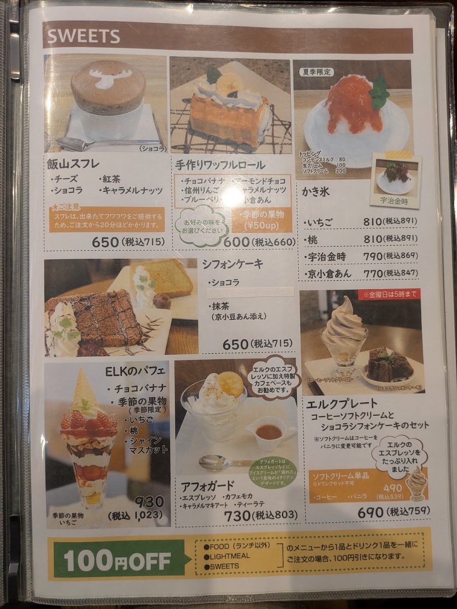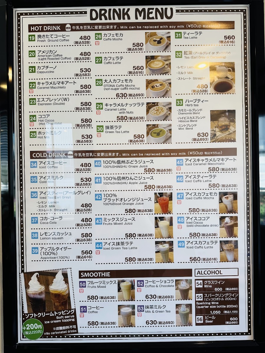 Food selections include light meals such as omelettes, waffles, curry dishes made with local pork, and pasta options. There are also desserts and sweets like chiffon cakes and seasonal soufflés available, which complement the beverage choices well.