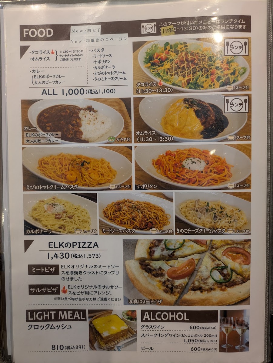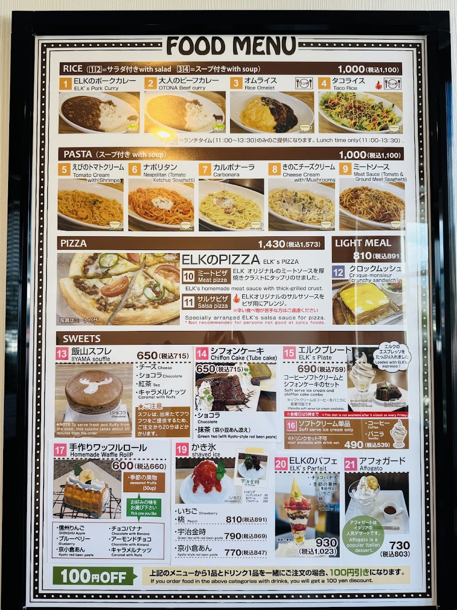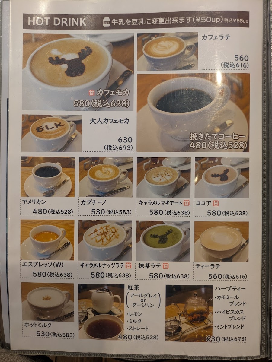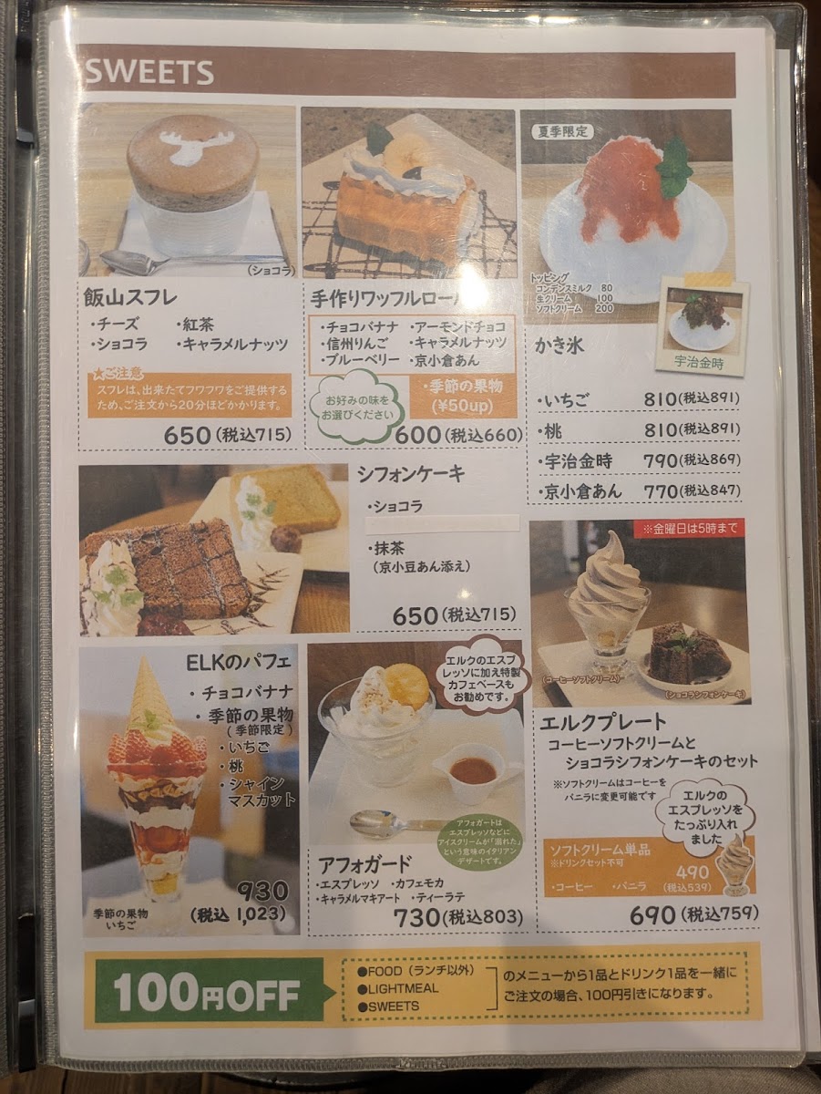 Food selections include light meals such as omelettes, waffles, curry dishes made with local pork, and pasta options. There are also desserts and sweets like chiffon cakes and seasonal soufflés available, which complement the beverage choices well.